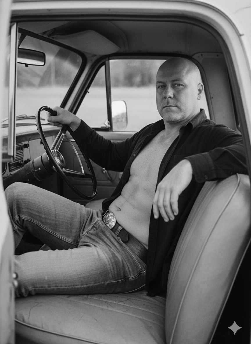 Man (Keep the reference face and body 100%) reclining casually inside an old pickup truck, framed through the open window, creating an intimate and cinematic composition. […]