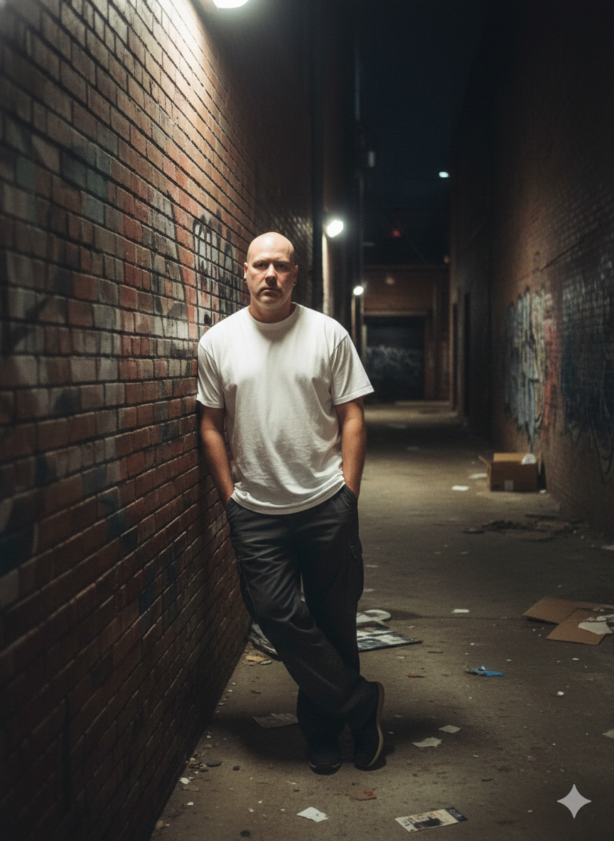 A moody, urban portrait of me standing in a dim, industrial alleyway, illuminated by a single, dramatic overhead light. I'm wearing an over sized white t-shirt […]
