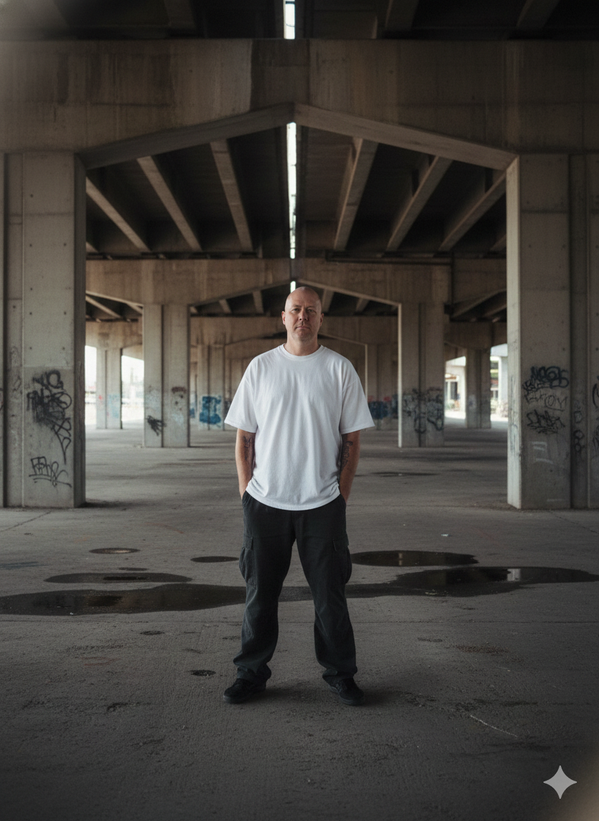 A moody, urban portrait of me standing under a desolate concrete overpass, the harsh architectural lines framing a lone figure. I'm wearing an oversized white t-shirt […]